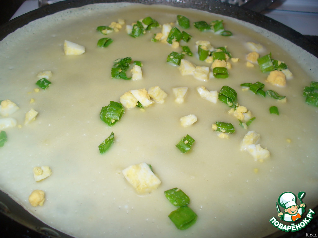 Нагреваем сковороду, наливаем на нее растительное масло (примерно 1 ст.л.), распределяем его по всей поверхности сковороды. Как сковорода и масло станут горячими, масло выливаем в тесто, хорошо его перемешиваем. Сковороду держим в левой руке, правой рукой поварешкой наливаем на сковороду тесто тонким равномерным слоем, и, пока оно не "схватилось", насыпаем сверху примерно 1 ст.л. на каждый блин припека. И печем блин.