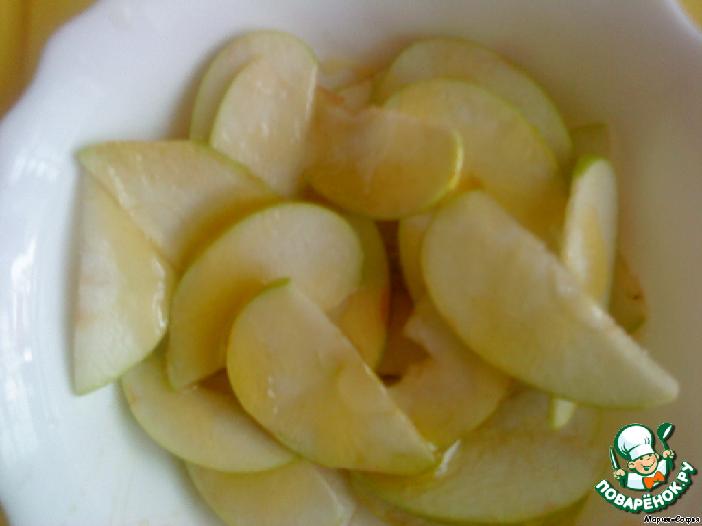 Яблоко помыть, удалить сердцевину и нарезать тонкими дольками. Подготовленные яблоки замариновать в соке половины лимона и 1ст.л. меда. Оставить на 30мин.