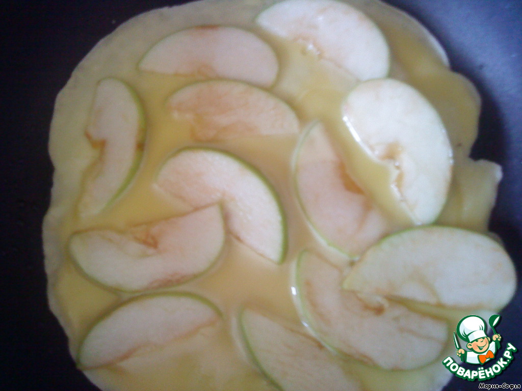 Распределить не большое количество теста по сковородке, сверху выложить яблоки.