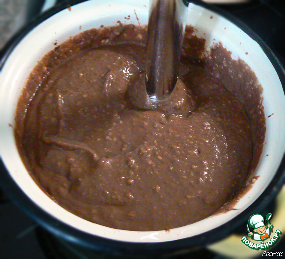Взять 400 мл кокосового молока (или соевого молока, или воды), поставить на огонь, добавить мелко дробленный миндаль, довести до кипения. Выключить огонь, всыпать какао, ванильный сахар, добавить масло и бананы, все пробить блендером (попробуйте на сахар, если покажется не сладким, добавьте его по вкусу). Я брала соевое молоко и масса после взбивания сразу стала густой. Если покажется жидковатой, можно добавить немного муки для густоты.