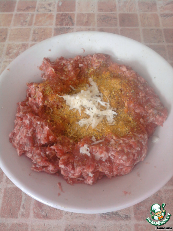 Сначала приготовим фарш: засыпаем его пачкой приправы (будьте внимательны! некоторые приправы содержат большое количество красного перца).