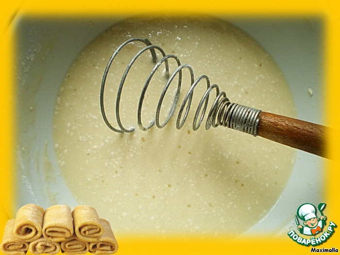 На небольшом количестве растительного масла испечь тонкие блинчики на среднем огне. На 1 блинчик - половина поварешки теста.