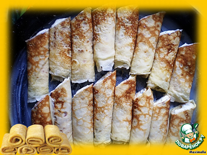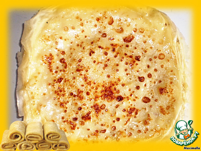 | Блинчики с творогом в новой интерпретации - под шубкой твердого сыра! Твердый сыр для этого блюда следует выбирать не соленый, тогда эти два сыра очень удачно будут дополнять друг друга и насыщать вкус. |