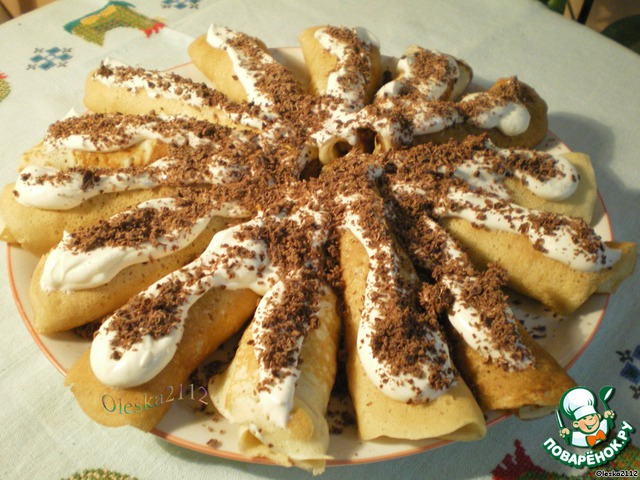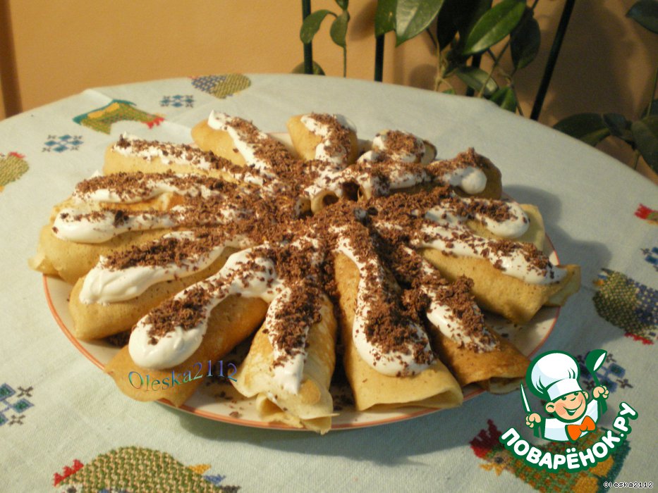 Взбиваем сливки с сахаром, шоколад трём на тёрке. Каждый блинчик-рулетик смазываем сливками и посыпаем тёртым шоколадом. Вот так.