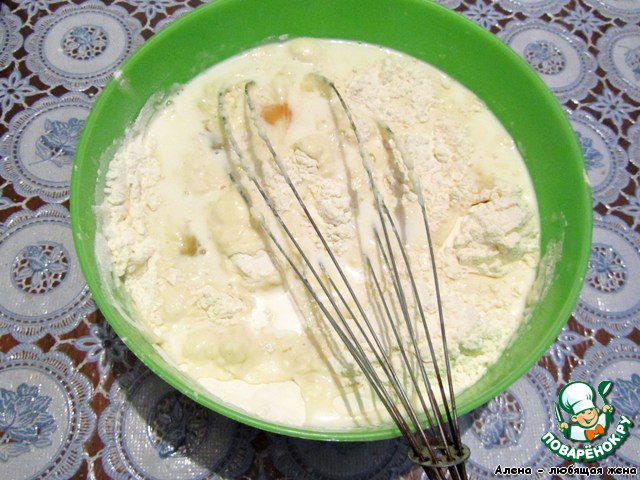 Для теста всыпать в глубокую миску муку, добавить соль, сахар и перемешать, добавить яйца и молоко, взбить все венчиком и оставить на час для расстойки
