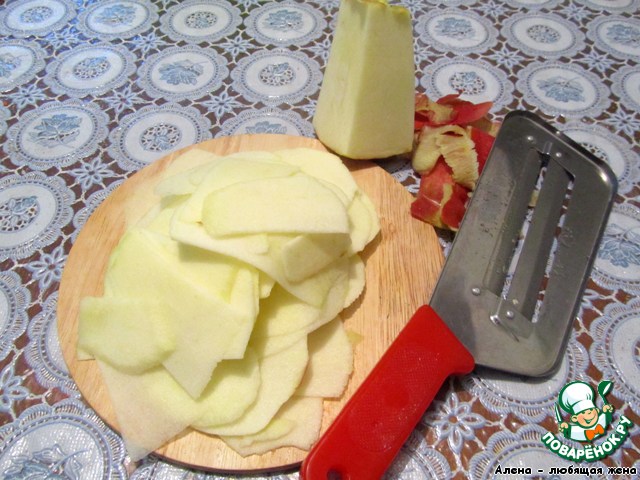 Этим временем большое яблоко нарезать на тоненькие пластинки, у меня на фото нож, с помощью которого я это сделала.