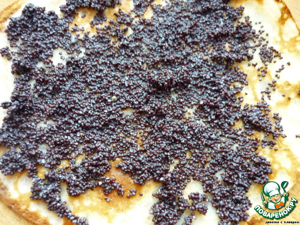 В кастрюлю влить 2 ст.л воды, добавить 1 ч.л. сахара и мак. Дать провариться минут 5. На 1-ый блин намазать маковую начинку, свернуть рулетом.