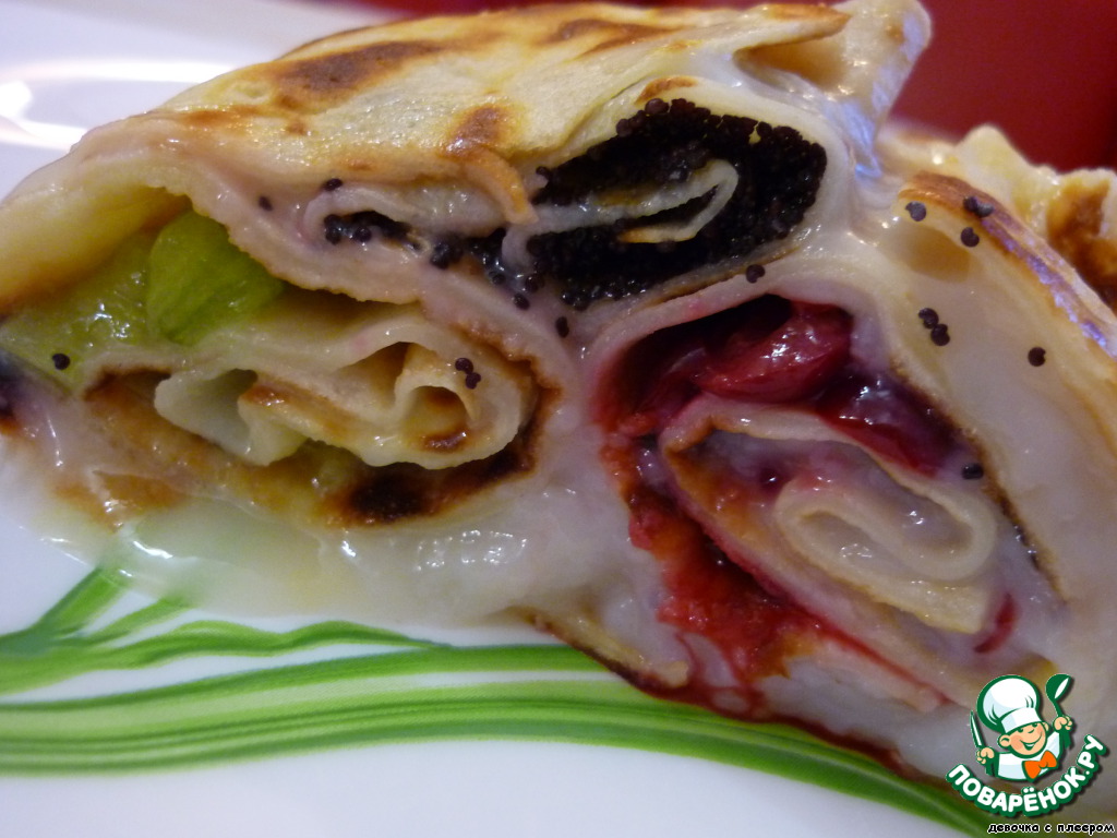 У меня была мороженная вишня. Порезать ее помельче. Выложить на 2-ой блин. Свернуть рулетом.