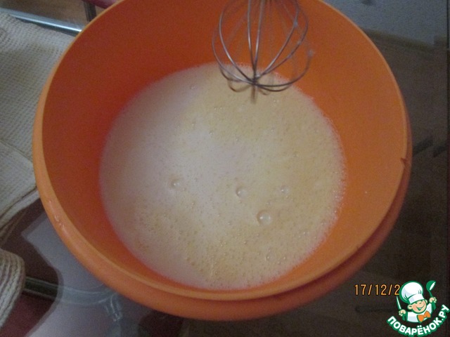 В большой миске взбиваем яйца, молоко, добавляем сахар, соль.