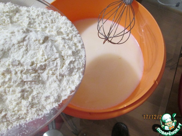 В теплом молоке разводим дрожжи. немного муки и сахара. Убираем в теплое место до активации дрожжей.