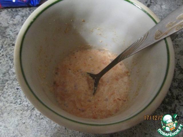 Подогреваем кефир добавляем в него соду и перемешиваем. Кефир начнет пениться и добавим к готовому тесту. кроме этого нальем пару ложек растительного масла. Перемешиваем и начинаем выпекать.