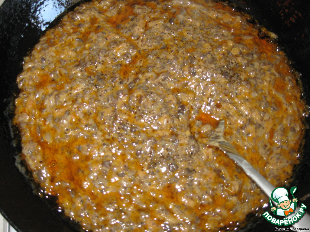 Грибы пропускаем через мясорубку, жарим на растительном масле около часа, добавляем лук, морковь, мелко нарезанный болгарский перец, тушим еще около 30 минут. Солим, перчим.
