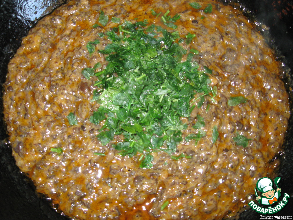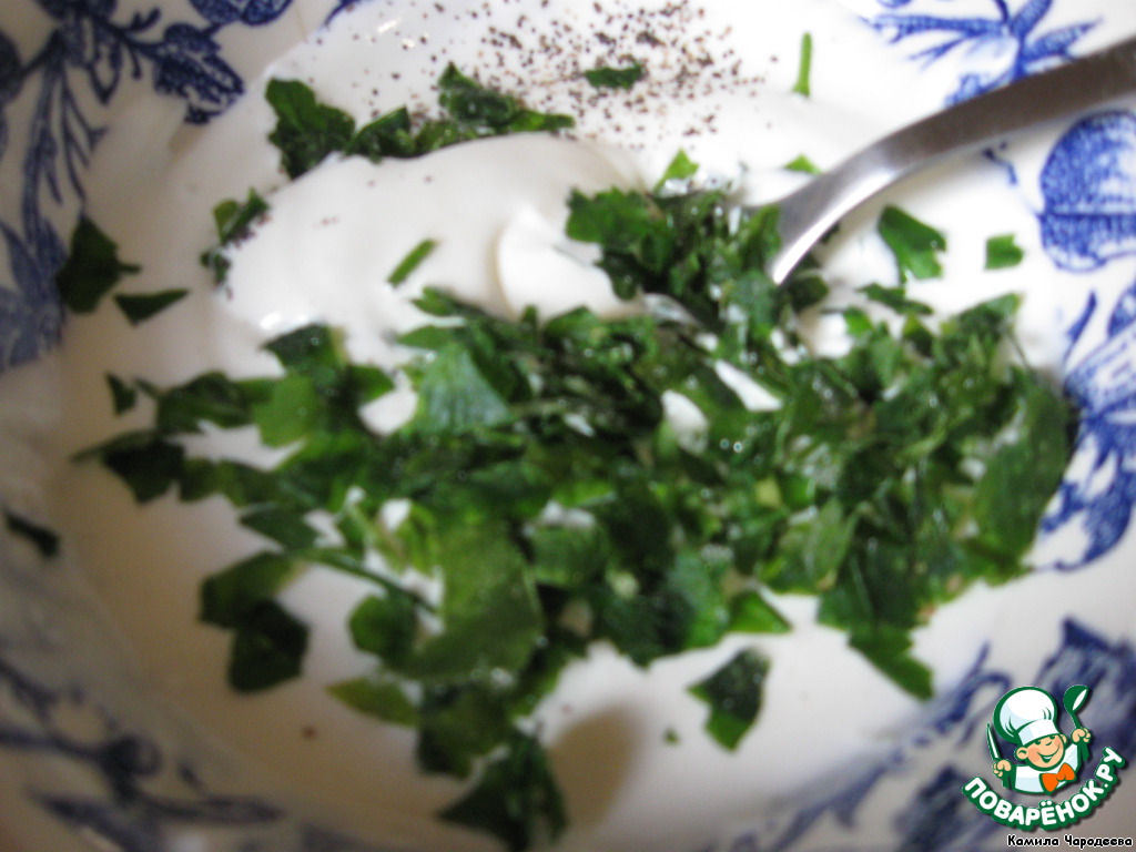 Готовим соус из сметаны, добавляем по вкусу соль, перец, чеснок, зелень.