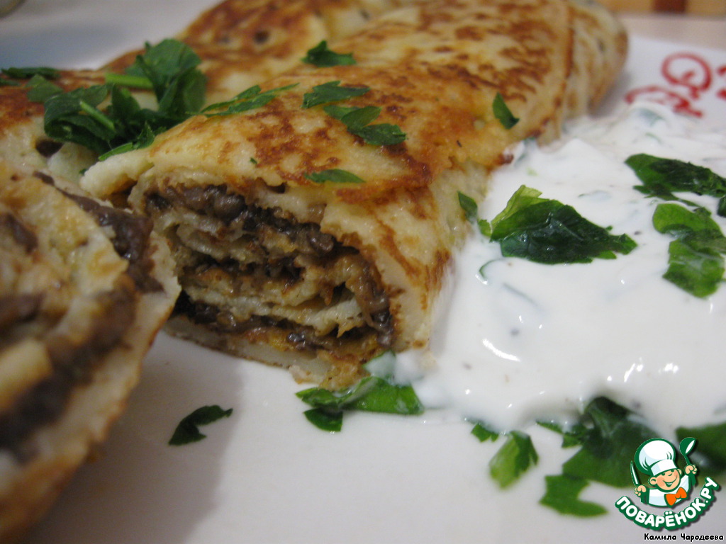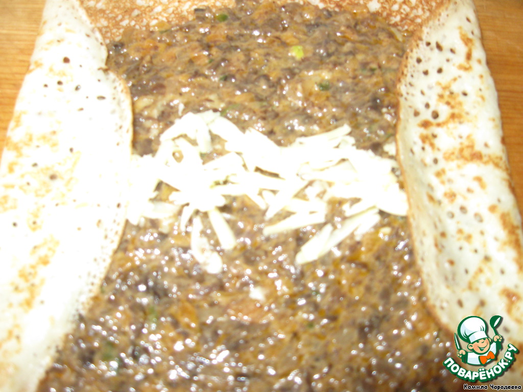 Блины перемазываем начинкой и посыпаем сыром. Сворачиваем.