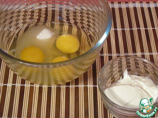 Приготовить заливку. Взбить яйца с сахаром, добавить сметану и еще раз взбить массу.