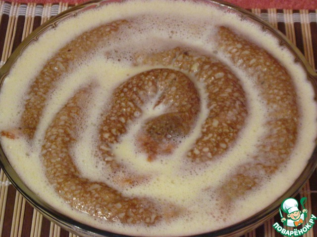 Залить сверху блины. Поставить в духовку на 30 минут. Запекать при температуре 190 радусов.