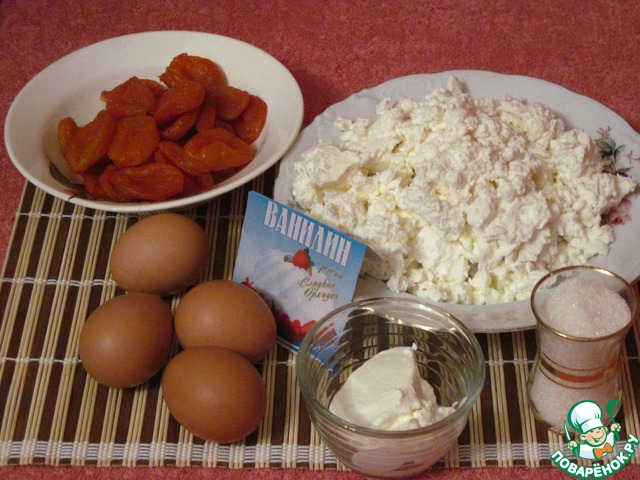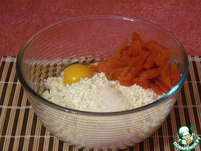 Сделать начинку для блинного пирога. Курагу залить горячей водой на 5 минут, обсушить на салфетке, нарезать кусочками. Творог протереть через сито. Добавить яйца, сахар, ванилин, все перемешать.