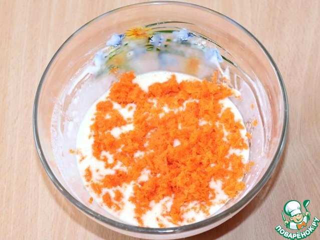 Очистите и натрите на мелкой терке морковь, смешайте с блинным тестом.
