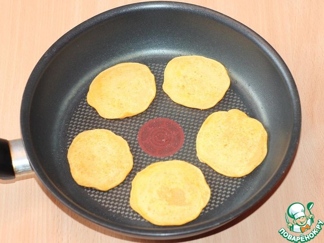 При помощи столовой ложки выкладывайте на неё кружочки небольшого размера, что бы блины были не слишком толстыми.