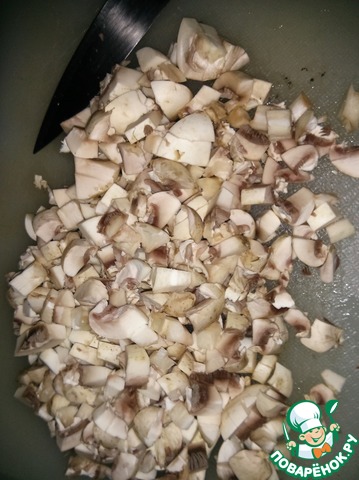 Жарим шампиньоны на сливочном масле до испарения жидкости, добавляем отварные грибы. Жарим 3-4 мин. Добавим половину приготовленного лука.