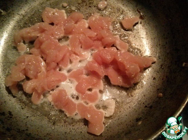 Для куриного жюльена нарезаем мелко мясо: филе и голень. Обжариваем. Добавляем грибной бульон, что остался после варки грибов, в нем притушим мясо.