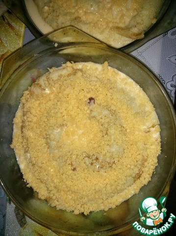 Заливку делим на две части. Первой частью заливаем грибную улитку. Во вторую добавим измельчённый чеснок и заливаем куриную улитку. Посыпаем обе улитки тертым сыром.