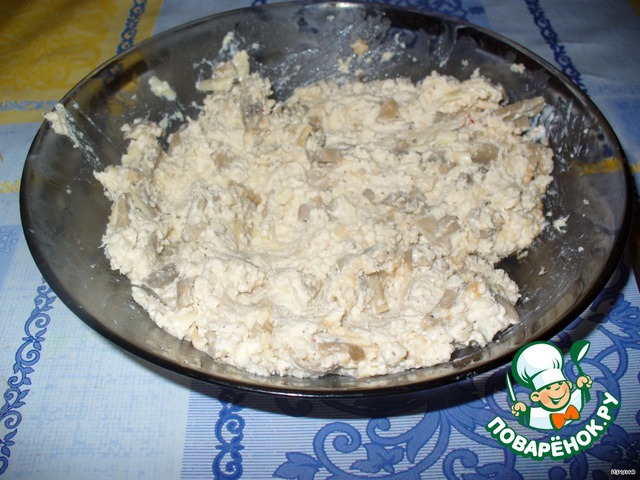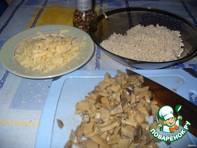 Отварное филе пропустить через мясорубку. Сыр натереть на крупной терке. Шампиньоны нарезать, не очень мелко.
