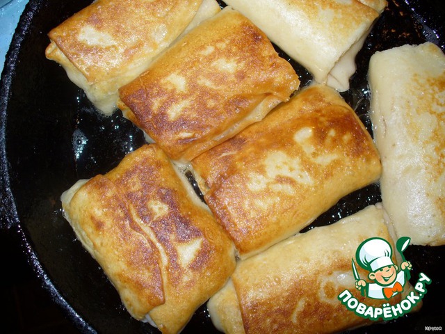 На сковороде разогреть растительное масло и обжарить блинчики со всех сторон. Подавать со сметаной.