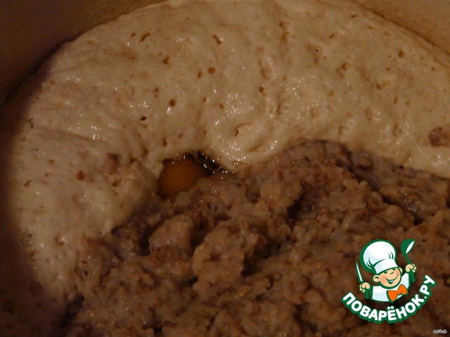 Тесто снова увеличилось, добавляем в него 2 яйца (лучше сразу их вынуть из холодильника, чтобы не холодные были), пюре из каши, перемешиваем и ждем пузырьки, чтобы начать выпекать блины.