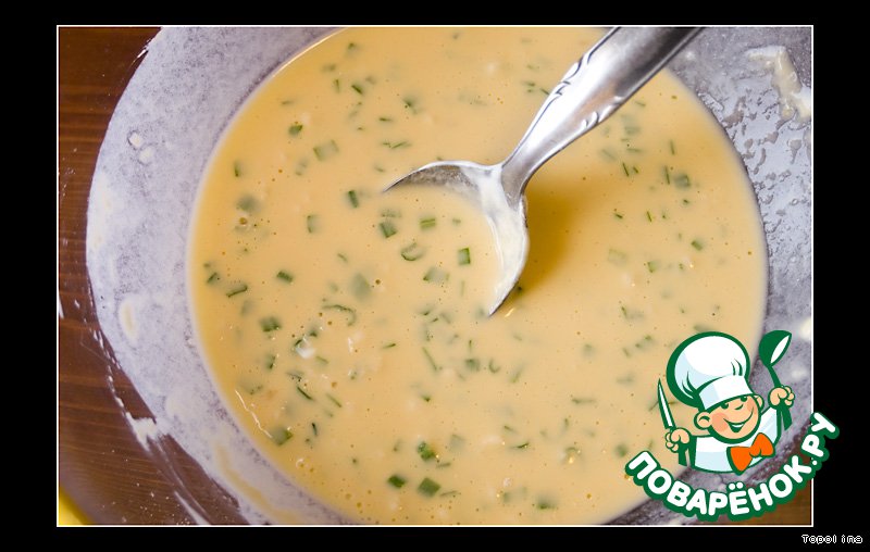 Минеральную воду, сливки, яйцо, муку, щепотку соли и 1 ложку мелко порезанного зелeного лука хорошенько размешиваем и отставляем минут на 10 отдохнуть.