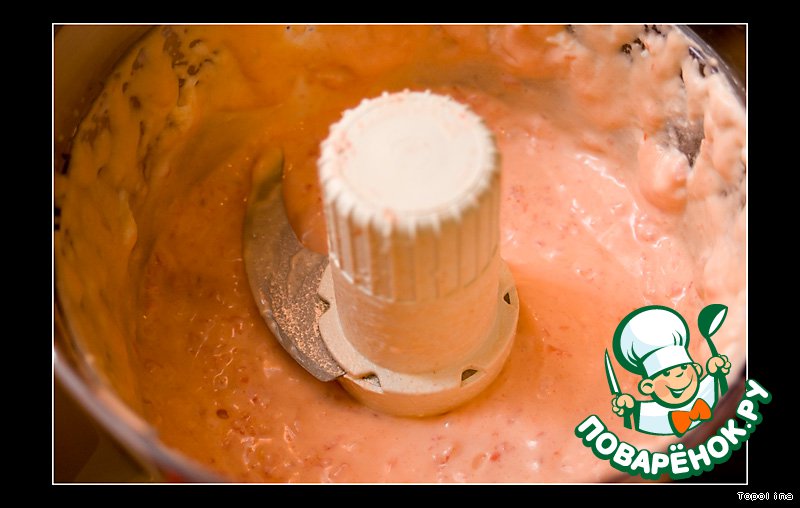 Рикотту и помидоры измельчить вместе в кухонном комбайне с солью (по вкусу). В рецепте было указано, что на 50 грамм рикотты должен быть 1 помидор, и на фото, приложенном к рецепту, начинка была довольно густая. Однако, я ж без свинства не могу, и после первой пробы, снятой после взбивания рикотты (еe я взяла в три раза больше указанной нормы), не долго думая бухнула помидорчиков по-более, а потом и ещe по-более. Пусть начинка более текучая, плохо удерживающаяся внутри, но с более выраженным томатным вкусом и более сочная.