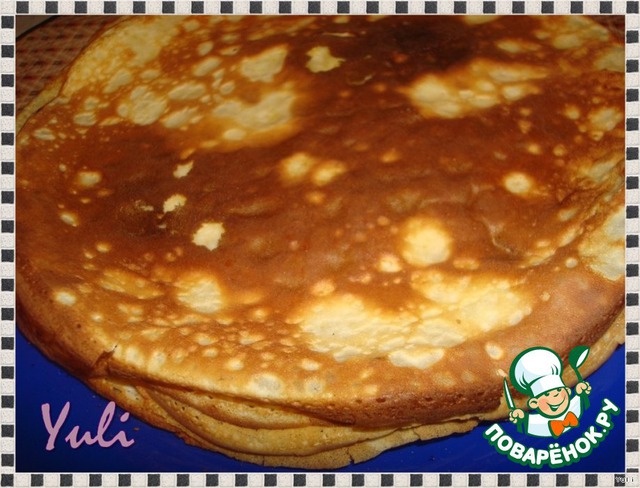 Испеките блины на разогретой и смазанной растительным маслом сковороде (получается примерно 10 шт.), сложите в миску и накройте.