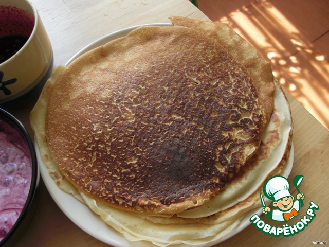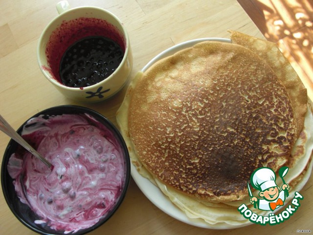 | Очень вкусный и быстрый завтрак. Блины самые обычные, можно даже купить в магазине готовые и разогреть их в микроволновке. Вся прелесть - в черничном соусе. У меня их даже два - один простой (свежая черника с сахаром, в микроволновке 30 секунд), второй - то же, плюс сметанка. Как это вкусно - словами не передать. Приятного аппетита! |