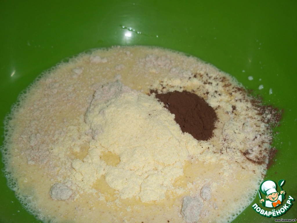 Добавляем муку ржаную, кукурузную и какао, снова перемешиваем