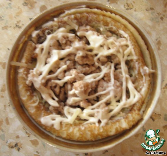 Затем заполняем фаршем, сыром - сверху чуть майонеза - для склейки.