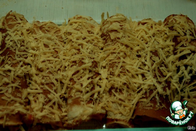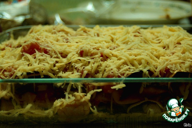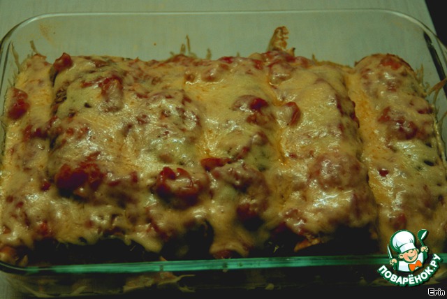 Укладываем рулетики из блинов на противень и посыпаем тертым сыром. Если все блины не помещаются, делаем еще слой. Его снова обсыпаем сыром.
