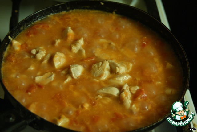 Поливаем все жидкостью, полученной от тушения курицы с помидорами.