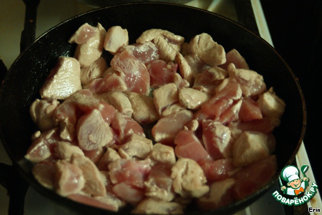Режем кубиками помидоры и добавляем к курочке, солим. Мешаем и тушим.