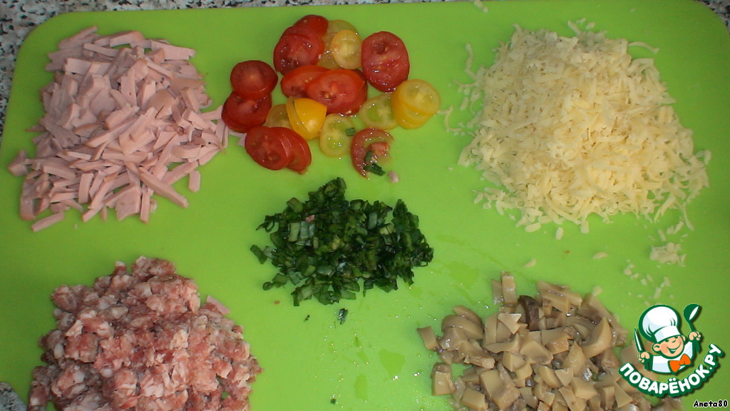 Теперь включаем фантазию и готовим нашу начинку. Она может быть разнообразной на ваш вкус. У меня была вареная колбаска, сыр, помидорки черри, фарш, грибочки и лук. Все это я мелко нарезала, сыр пропустила через терку.