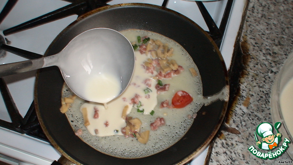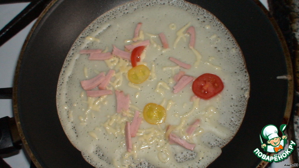 Наливаем тесто на сковороду, сверху равномерно распределяем колбасу, сыр, помидоры, затем слегка заливаем тестом, чтобы оно едва покрыло начинку. Немного убавляем огонь и жарим с двух сторон.