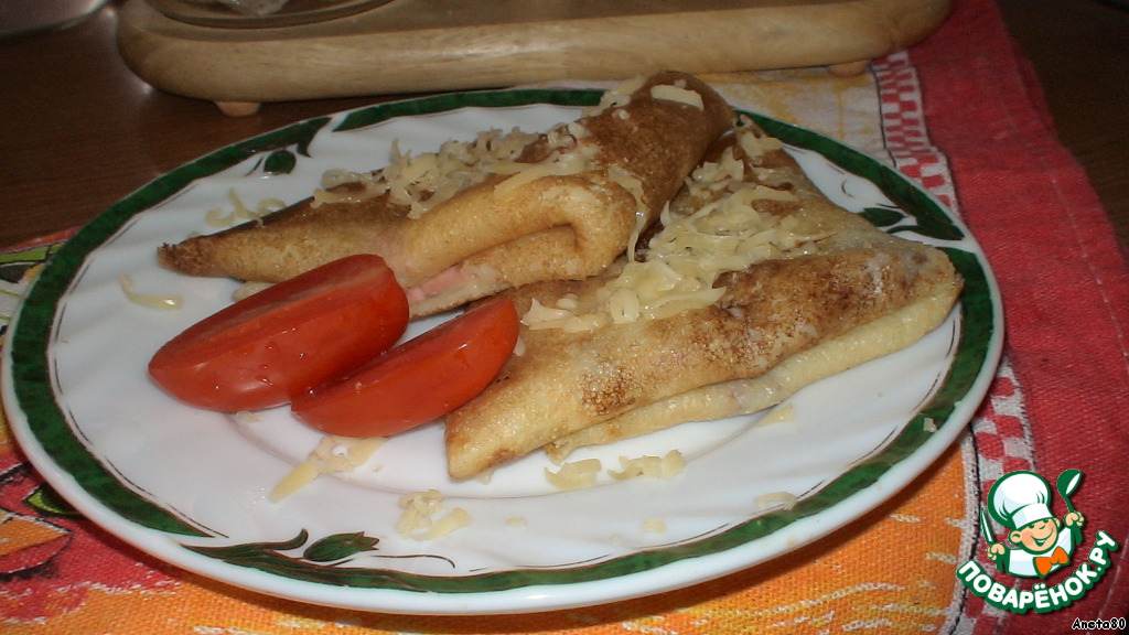 Готовые блинчики сворачиваем, как вам нравится, я свернула на 4 части (как это делают французы). Посыпаем оставшимся сыром и отправляем в разогретую духовку 220 на 5 минуток.