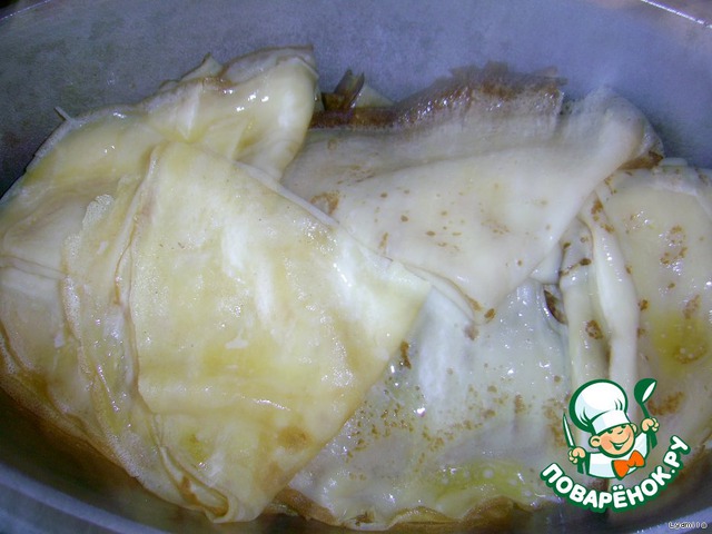сложить слоями в кастрюли или в какую-нибуть емкость с крышкой,чтобы можно было поставить в духовку(я сложила в жаровню).Каждый слой хорошо помазать растопленным сливочным маслом и так уложить все блины.