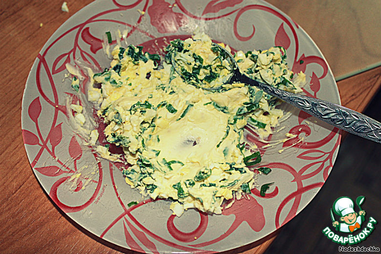 Перемешать лук с творожным сыром (со вкусом копченого лосося) и яйцом. Лосось нарезать полосками.