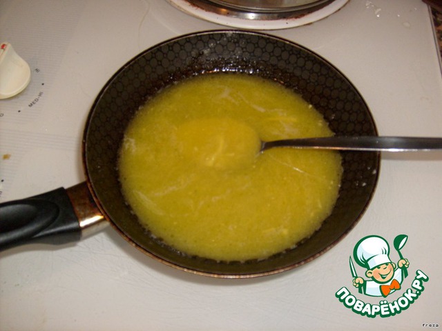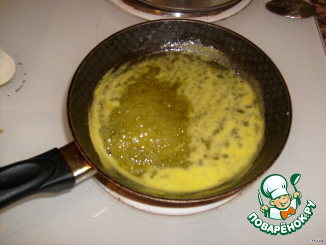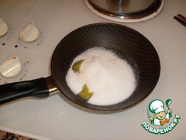 Для этого берем сковородку, ставим на медленный огонь, кладем масло, сахар и немножко растапливаем, периодически помешивая
