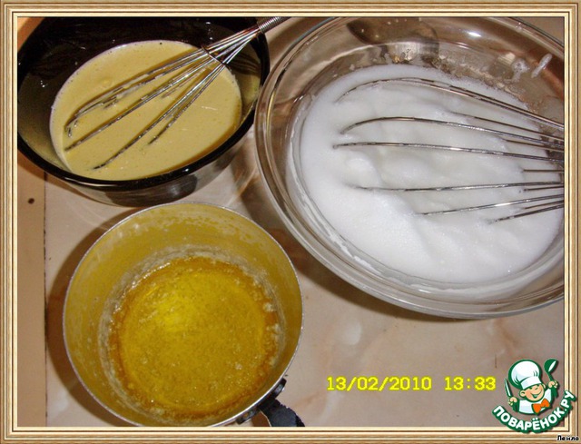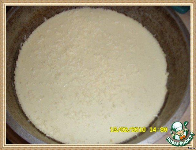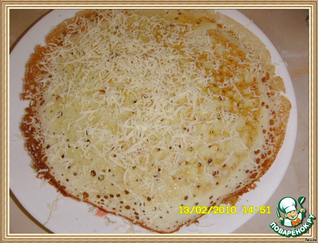 [b]По рецепту. [/b][quote] Между тем хорошо разогреть духовку и сковороду, на которой будут выпекаться блины. Когда тесто поднимется, вылить его тонким слоем на смазанную маслом сковороду, сверху обсыпать тертым сыром, поставить сковороду в духовку. Переворачивать блины не нужно. Готовый блин выложить на разогретое блюдо, смазать маслом, и еще раз обсыпать тонким слоем тертого сыра. Таким же способом испечь второй блин, положить на первый, смазать маслом и обсыпать сыром. И так далее, до 5-7 блинов в стопке. Готовые стопки блинов перед подачей прогреть в духовке, чтобы блины слиплись, затем разрезать на куски.[/quote]