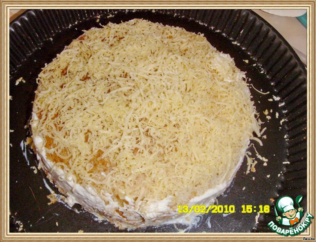 Складывая стопкой, сыпьте между слоями тертый голландский сыр (сыра не жалейте). ;-)