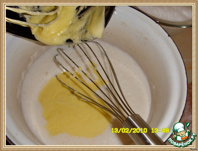 Влить в кастрюлю 2 стакана чуть теплого молока, растворить в нем дрожжи (добав. сухие), всыпать пшеничную муку, и замесить тесто. Накрыть кастрюлю полотенцем, дать опаре подойти.