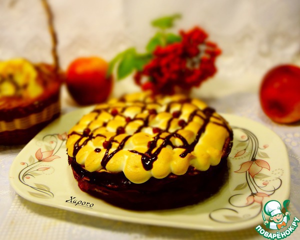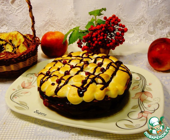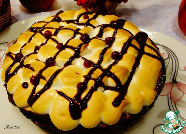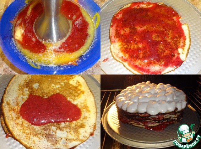 Взбитые с сахаром белки отсаживаем в корнет и наносим на верхний блин любой, произвольный узор, укрыв всю поверхность.
