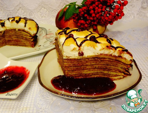 Каждый блин укладываем в жаропрочную форму и смазываем масляно-брусничной смесью. И так все блины. Последний блин смазывать не будем.