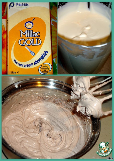 Взбила 200 г белых сливок с двумя каплями ромовой эссенции и 3 ст. л сахара. 100 г сливок с растворимым кофе и 1 ст. л сахара.